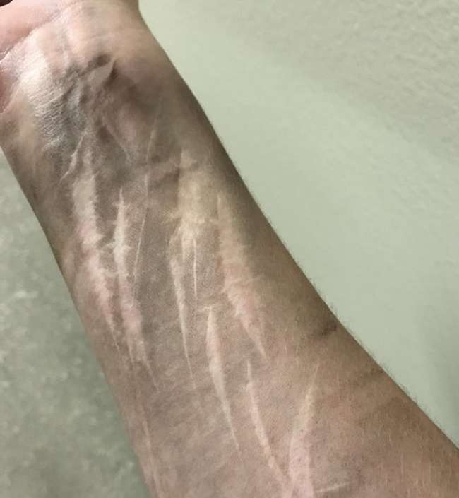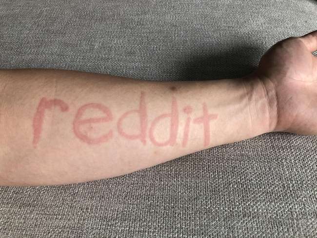▼皮膚劃紋症患者,可以在手上直接寫字。