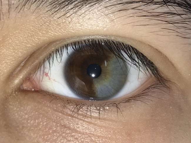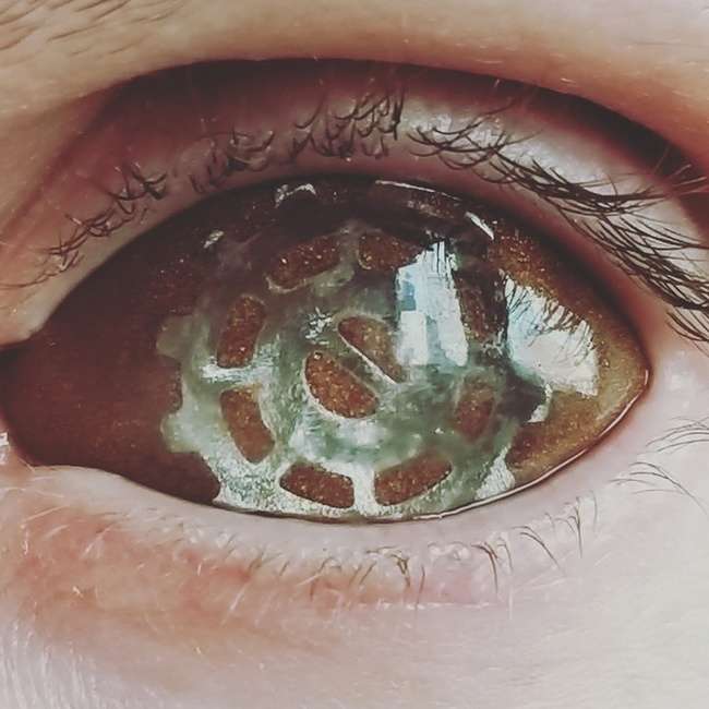 ▼因為遺傳基因退化而失去了瞳孔,眼科醫生在他的眼眶內放置了這樣的義眼。