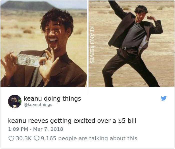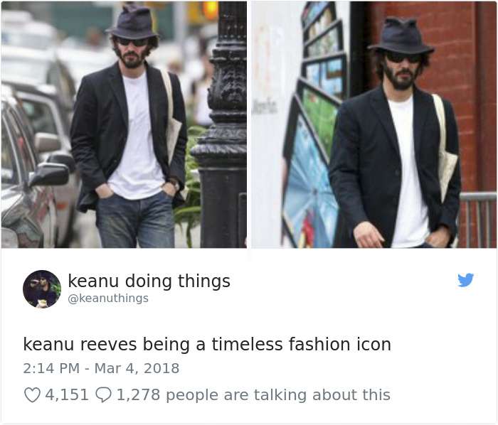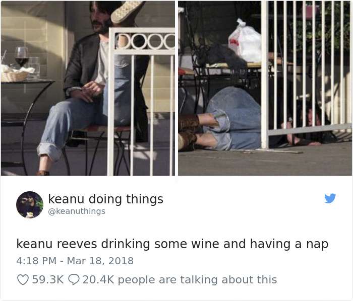 2018年04月01日基努李維(Keanu Reeves)是許多人心目中的男神,他的一舉一動也經常受到媒體的關注。有網友將他平常的舉動,配上廢到令人噴笑的旁白,上傳到「keanu doing things」的推特上,一起來看看網友到底多麼有創意和幽默感吧: