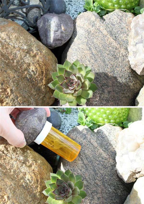 ▼把鑰匙裝進瓶子,黏到花園的石頭後面。