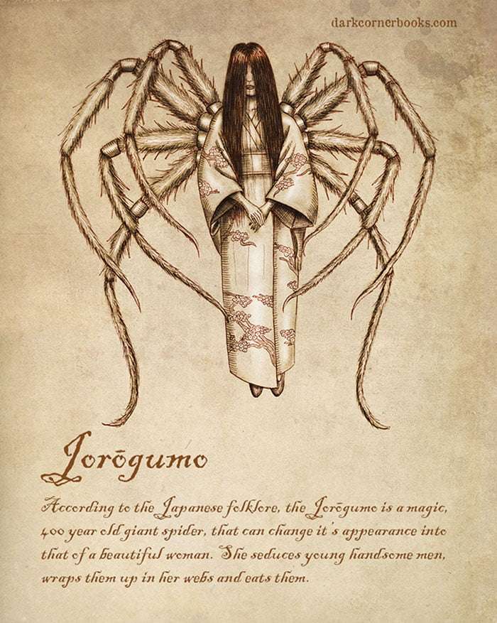 ▼「絡新婦」:這是日本民間傳說中,一隻活了400年的巨型蜘蛛。牠會幻化成美女,引誘年輕俊美的男人,接著把他們裹入網裡吃掉。