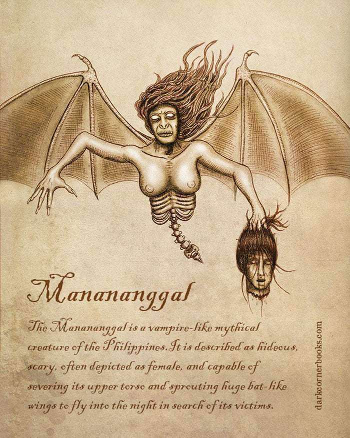 ▼「Manananggal」:這是菲律賓神話中類似吸血鬼的生物,常以女性形象出現,但非常醜惡駭人。牠的上半身、下半身能夠分離,在夜間揮動巨大的蝙蝠翅膀尋找受害者。