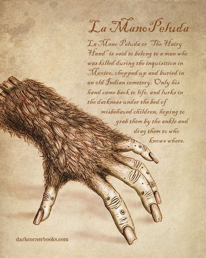 ▼「La Mano Peluda」(毛手):傳說一名男子在墨西哥受審判後被處死,他被分屍,埋進了印度古墓中。後來他的手復活,潛藏在黑暗裡,專門躲在淘氣小孩的床底下,並找機會抓住他們的腳踝,把他們拖到誰也不知道的地方。