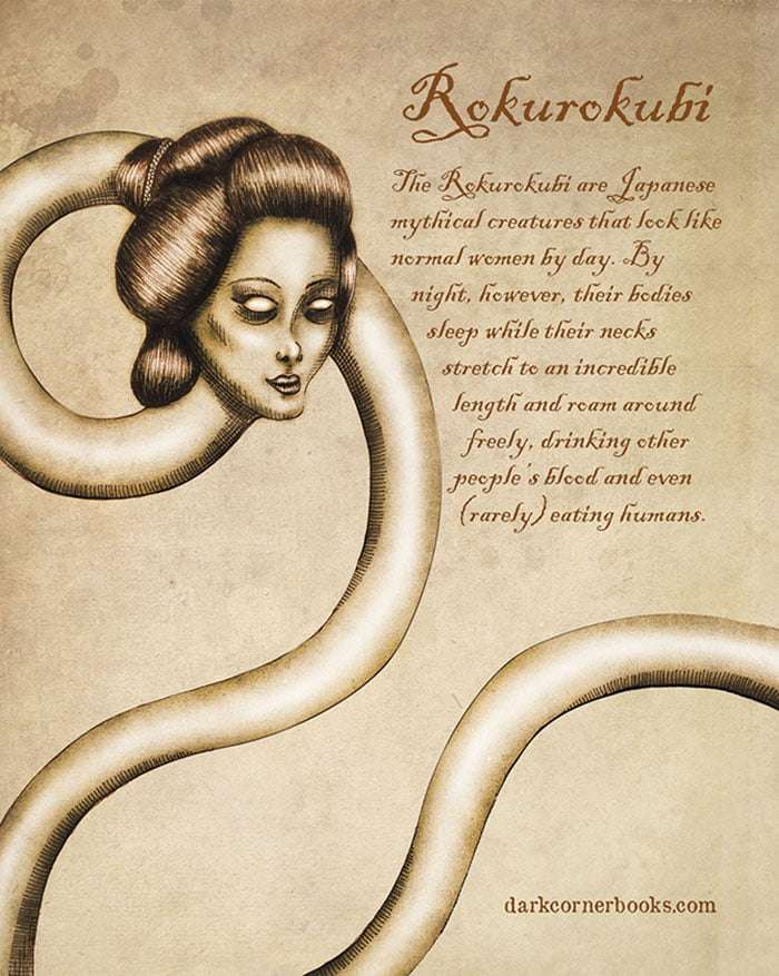 ▼「轆轤首」:這是日本神話中的生物,牠白天看起來是普通女性,到了晚上身體會睡著,脖子卻伸長到難以想像的長度。牠的頭部可以自由移動,有時候還會喝人血、吃人肉。