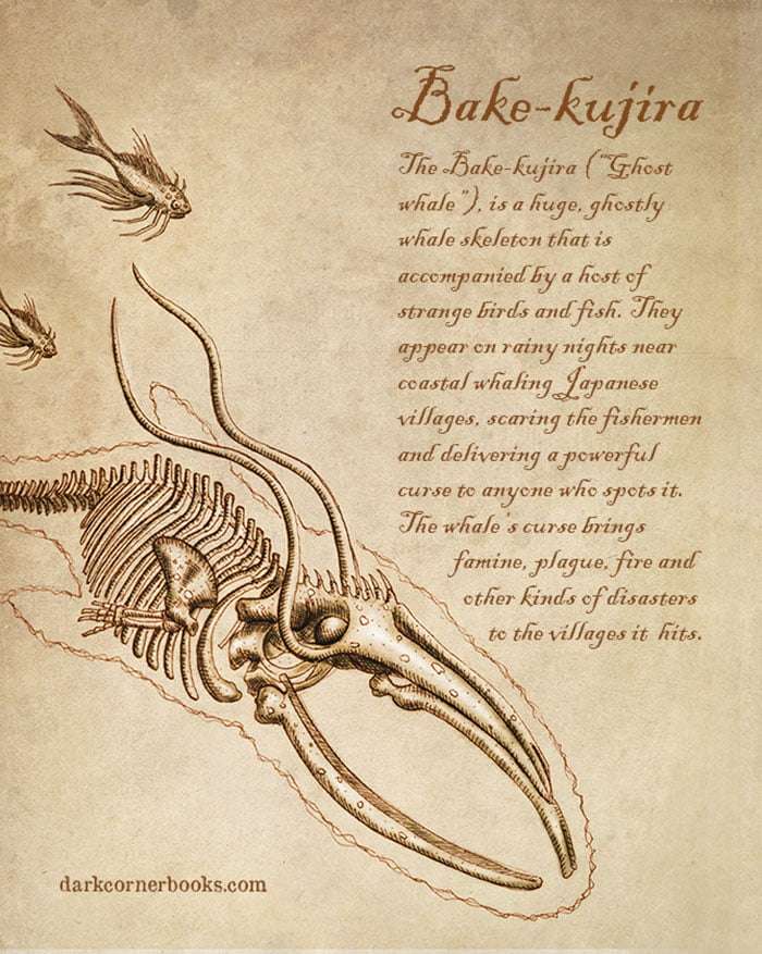 ▼「Bake-kujira」(幽靈鯨):這是一種巨大的幽靈般的鯨魚骨架,身邊有很多怪鳥奇魚。牠會趁著雨夜,出現在沿海的捕鯨小漁村,恐嚇漁民的同時,詛咒所有牠發現的人。牠的詛咒會帶來飢荒、瘟疫、火災和其他災難。