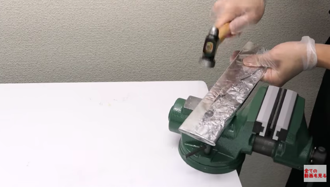▼首先用錘子敲打鋁箔紙,將它敲成結實的一片,期間還要放在火上燒,以便敲得更結實。
