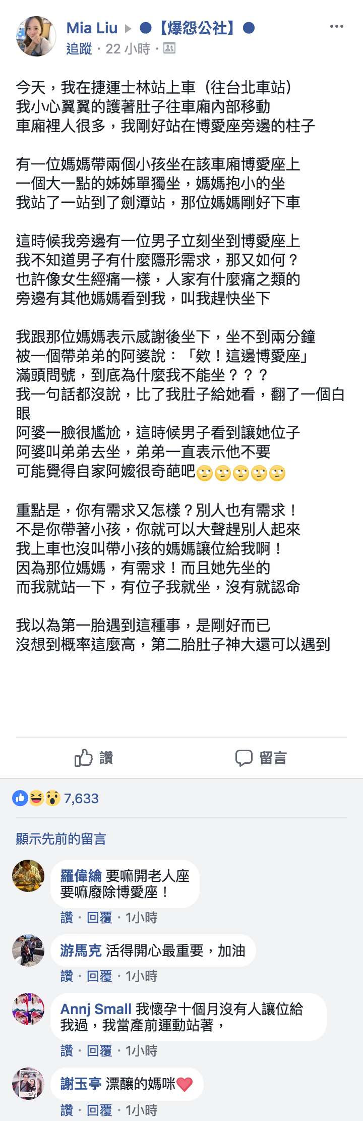 2018年04月05日博愛座在過去引發不少爭議,但「博愛座魔人」總是有更上一層的驚人事蹟。一位懷孕的年輕媽媽敘述,她挺著大肚子坐博愛座,卻被阿婆點名要讓給孫子坐,讓她氣炸:「難道這顆是子宮肌瘤嗎?」