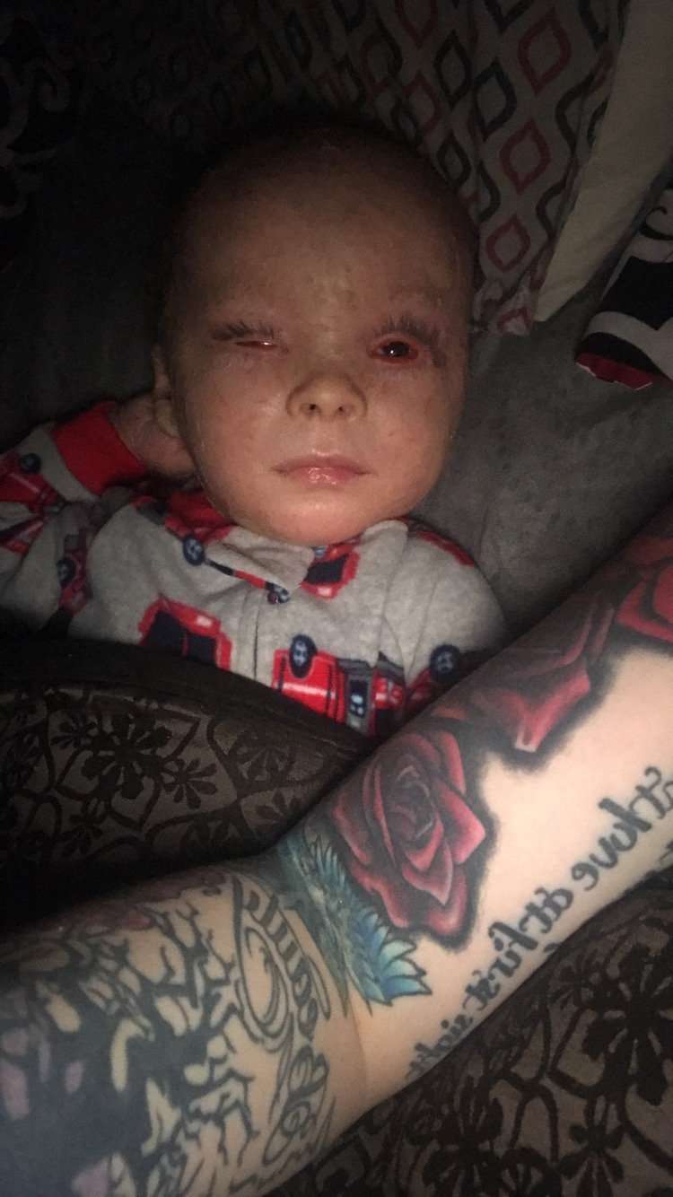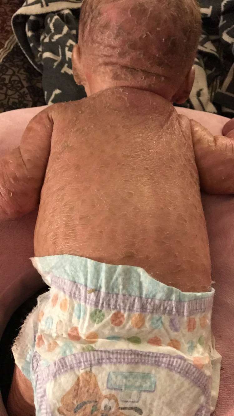 ▼21歲的媽媽Zach Padelford表示:「Carter剛出生時全身通紅,皮膚很緊繃,看起來很痛,他甚至沒辦法閉上眼睛。這種病讓他的皮膚像魚鱗一樣堆積成一片片,限制了他的移動過能力,他也沒辦法排汗。」「罹患這種病的嬰兒很容易患上突發性成年人死亡綜合症(SIDS),如果溫度過熱,他們會窒息而亡。我每天必須用8次不接觸式溫度計來保證他的體溫穩定。」