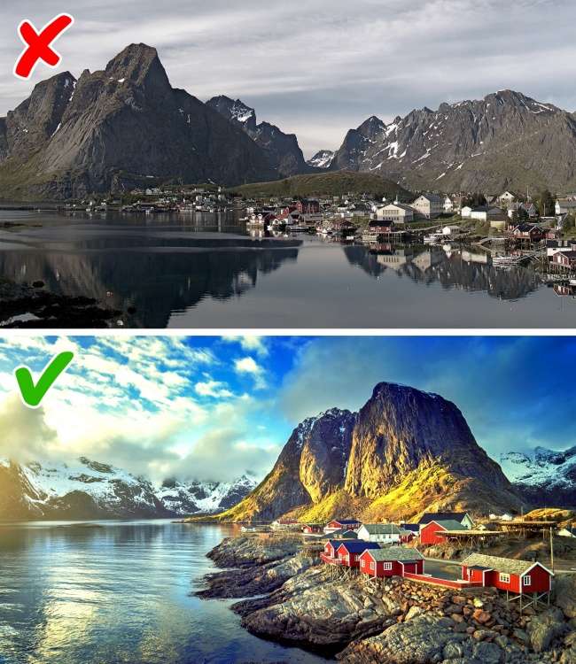 ▼這兩張照片是在挪威的同一地點拍攝的,第二張看起來明顯漂亮很多,因為攝影師在附近走了好久,終於找到了最好的角度。從這裡可以看到遠處的山峰、近處的岩石和房屋。岩石是照片的重點,其餘是背景。他等到太陽照亮岩石才按下快門,通過後製把照片變得更亮了一點。
