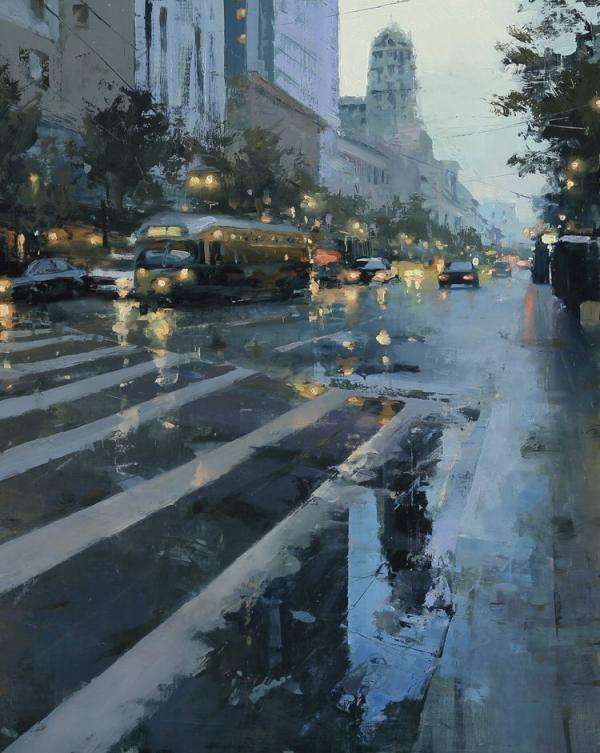 ▼曾新耀繪製的多為美國舊金山的城市景觀,白天或是夜晚、晴天或是雨天,留學舊金山的他,筆觸下也隱含了對這邊的情感,輕重濃淡、乾溼厚薄都恰如其分。