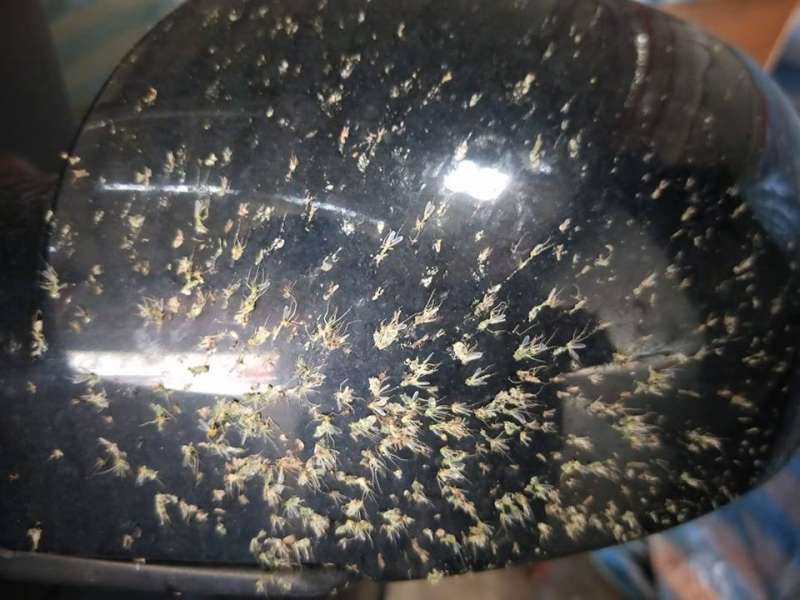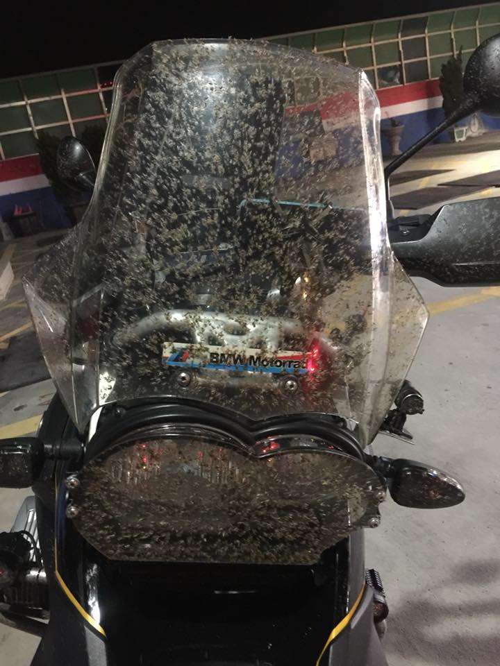 ▼不僅是安全帽,連機車的前面板也都是滿滿的小昆蟲,實在令人觸目驚心。