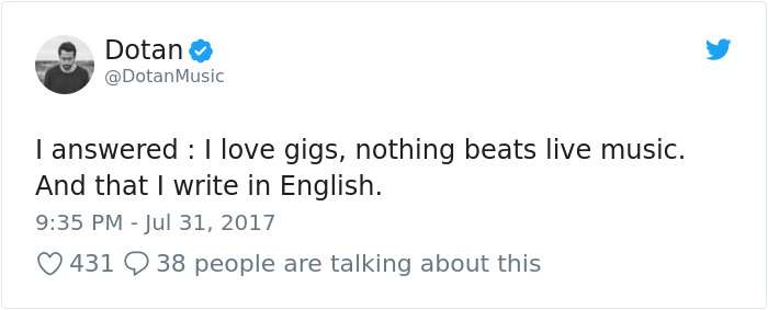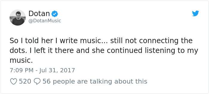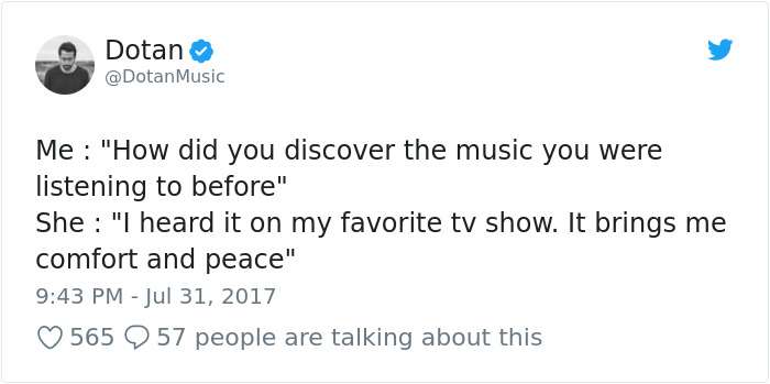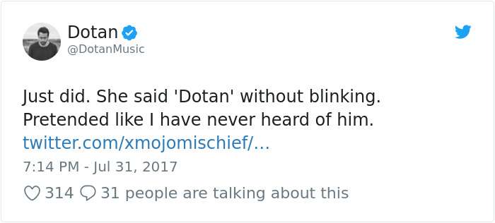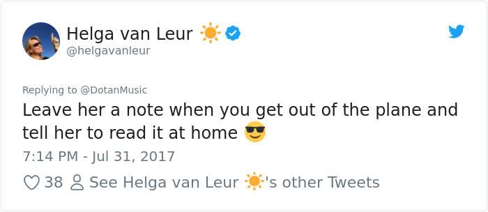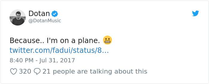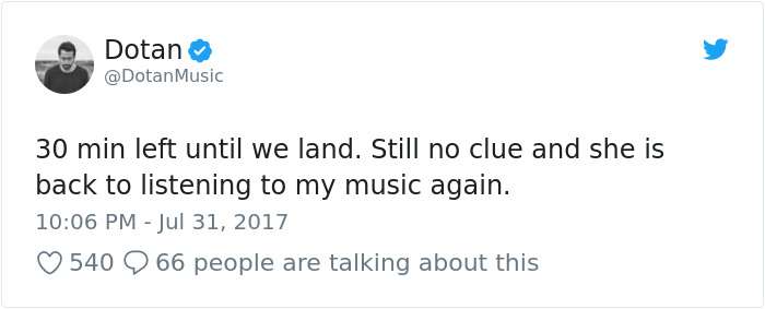 ▼直到下飛機,那名女孩也沒有發現旁邊的人就是Dotan。她看到字條,又看了推特,這才意識到這件事,給Dotan留言說:「真不敢相信我居然沒認出你,也沒意識到你整個航程中給我的所有提示。因為某些原因,我一直不知道你長什麼樣,但我第一次聽到你的歌,就去買專輯了,之後就一直不間斷循環聽。大部分我喜歡的歌手我都不太能認出來,因為我一般只是聽歌,我以前一直以為Dotan是個樂隊名……我把這件事告訴了媽媽,她也覺得難以置信。之前我們有一段很艱難的日子,是你的歌激勵我們,陪伴我們度過,這甚至超過你的想像。請繼續創作美妙的音樂,我下次一定會認出你的!」