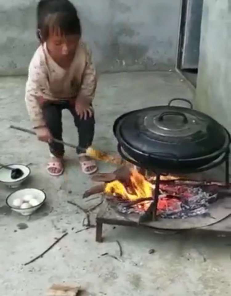 ▼到了中午要吃飯的時間,姐姐捲起袖子有模有樣的做飯。她獨自生火煮飯,還時不時的用湯匙檢查飯煮熟沒有,完全就是一副「小大人」的樣子。