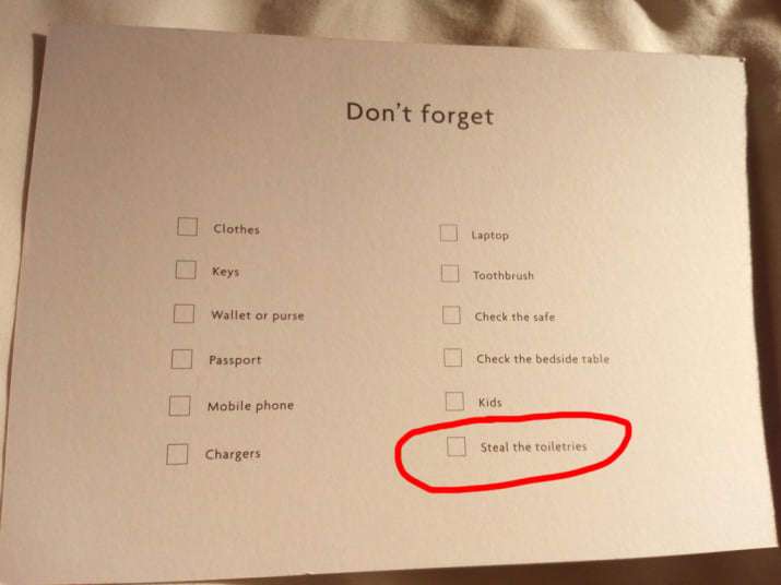▼飯店的備忘清單上,還提醒你「偷洗漱用品」。