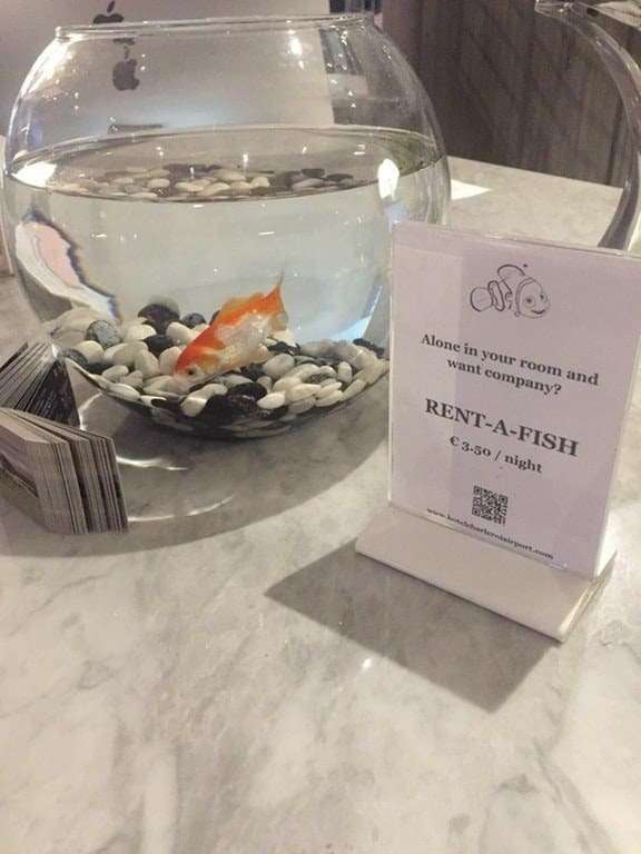 ▼飯店提供「租魚服務」,一晚3.5歐元(約台幣125元),就有小金魚陪你入眠。