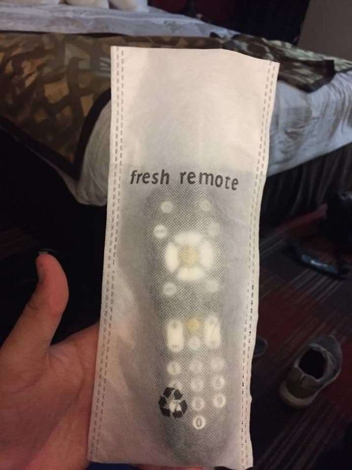 ▼都說飯店的遙控器是最髒的,這間飯店就提供一次性保護套。