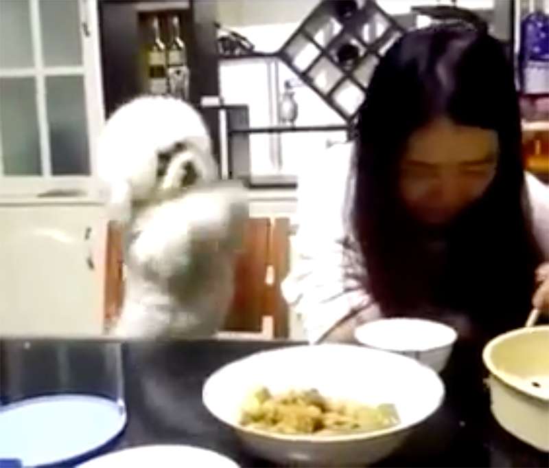 影片中的狗狗好聰明,見主人不分食物給自己吃,還生氣推她一下,太搞笑了吧。