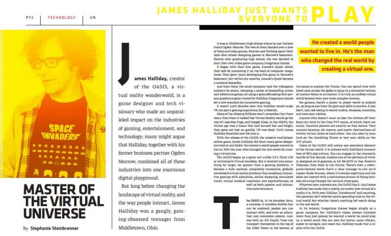2017年12 月10日,《一級玩家》曾發布首部預告片,片中1分10秒處,其實隱藏另一個二維碼。掃入後會進入一個網頁,裡面紀錄創造者詹姆斯·哈利迪的文章,文章的作者 Stef Steinbrenner 是 1985 年電影《七寶奇謀》中的一個角色,這個電影也有同名的遊戲,MSX 版和 FC 版由科樂美移植。