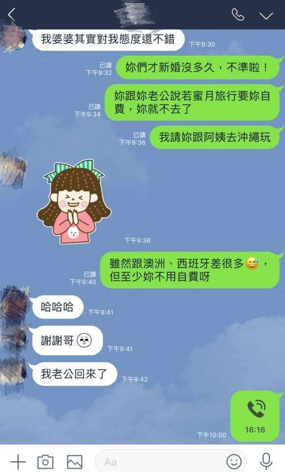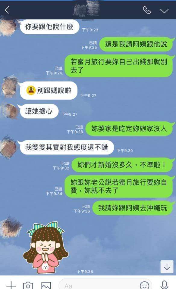 2018年04月26日跟老公蜜月旅行,婆婆、小姑要跟就算了,老公還叫她「自費」,事件被女方表哥知道後,相當不悅地將對話記錄放在臉書「爆料公社」後,當事者老公引發眾網友砲轟。