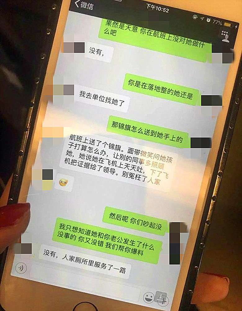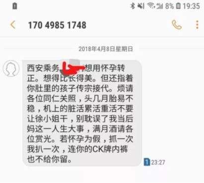 ▼接著她還親自買機票登上徐女服務的班機,將這面錦旗拿著走來走去,對其他空姐要求她們好好照顧「老公的洩欲工具」,還微笑著問徐女:「這孩子該怎麼辦呢?」要求徐女好好安胎將孩子生下來,最後還放狠話「如果懷孕是假的,我見妳一次扒一次,連妳的名牌CK內褲一起扒下來」讓徐女嚇得躲進廁所不敢出來。