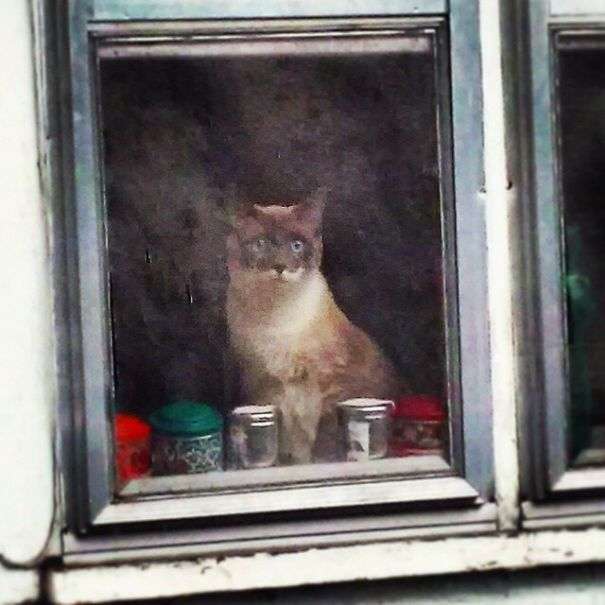 ▼透過髒兮兮的窗戶拍攝裡面的貓咪,很像油畫。