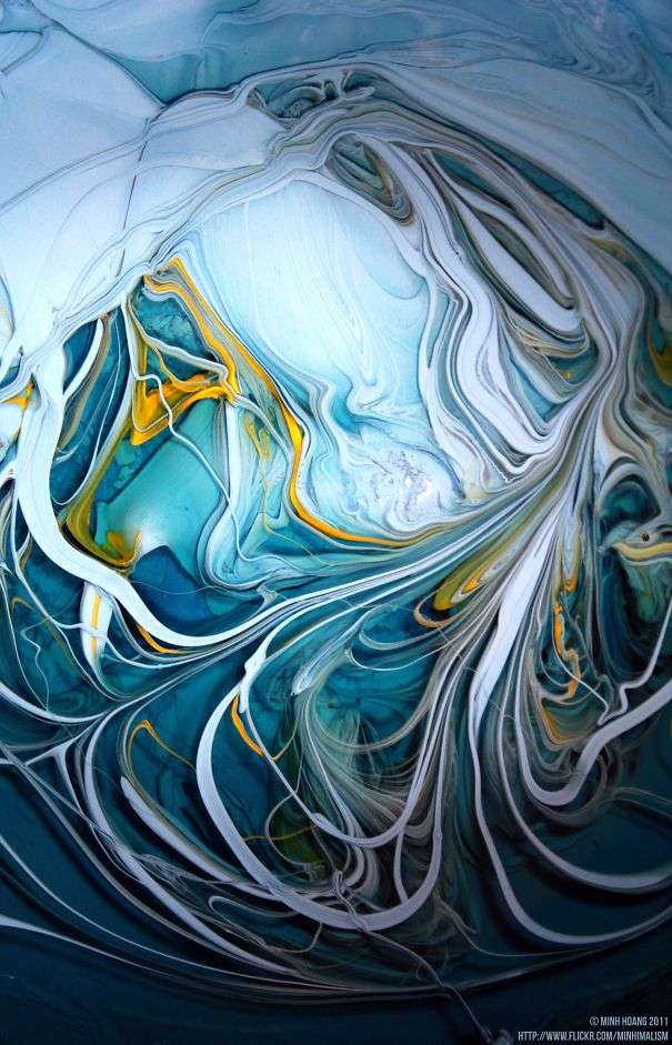 ▼黃色、藍色油漆混合,還沒有攪拌均勻。