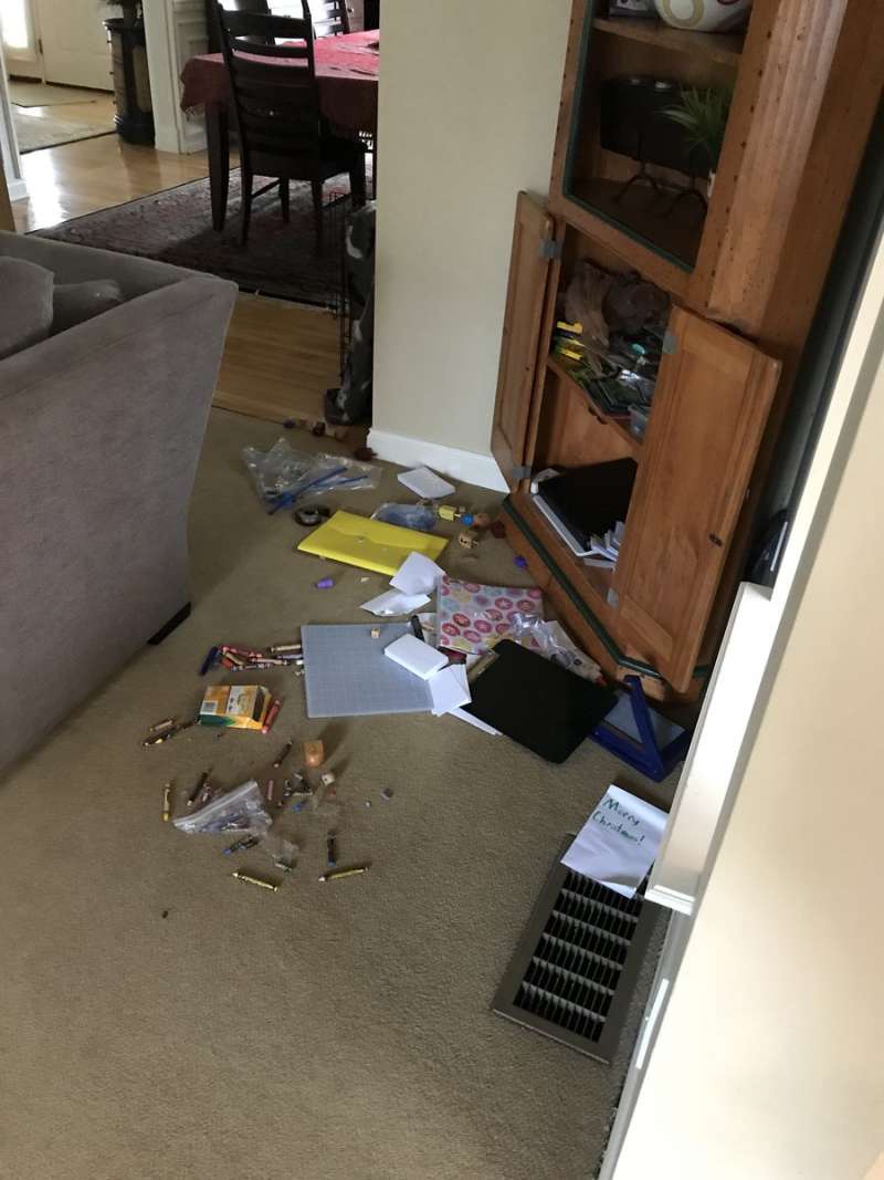 ▼Audrey Rosenstein家有一隻叫Theo的柯基犬。那天他回家時,發現Theo把家裡弄得一團糟,客廳的櫃子全都打開,裡面的雜物灑一地。他很生氣,但自己養的狗,哭著也要負責到底,只能摸摸鼻子,認命過去打掃。