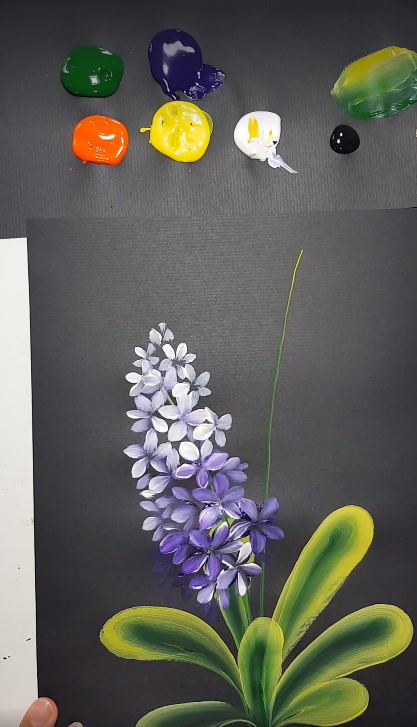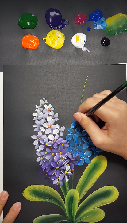 ▼藝術家用畫筆和顏料描繪出一朵栩栩如生的風信子,白紫相間的色彩過渡和嫩綠的葉子完全就像真的一樣。
