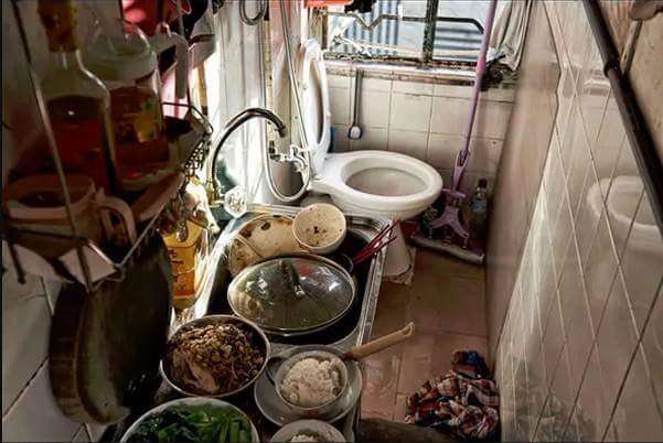 ▼在馬桶旁邊洗菜備料、烹煮食物,實在令人「胃口大開」…