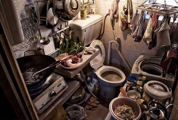 ▼由於屋內都被分割成了棺材房,廚房也只能設置在廁所內。