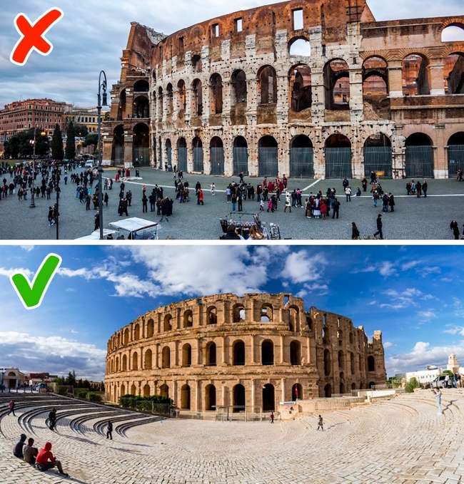 ▼義大利,羅馬競技場 vs 突尼西亞,傑姆圓形競技場:想參觀羅馬競技場,必須耐心排隊。突尼西亞的傑姆圓形競技場就不一樣,建築保存相對完整,遊客不多,價格也不貴。