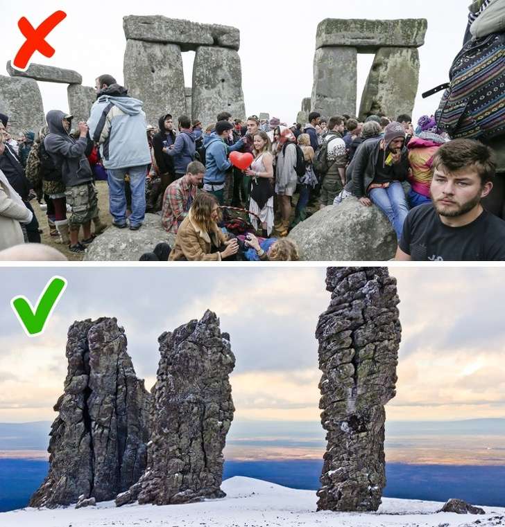 ▼英國,巨石陣 vs 俄羅斯,曼普普納岩石群:靜靜欣賞巨石陣幾乎是不可能的事,僅去年1年,就有150萬人參觀。俄羅斯的曼普普納岩石群是很棒的替代景點,那裡交通不夠便利,但你不會被吵鬧的旅遊團打擾。這七條巨型的非正常形成石柱非常壯觀。