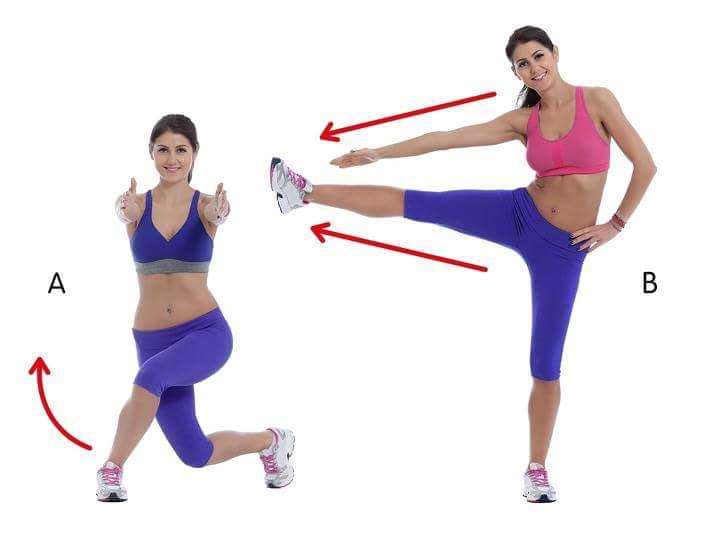 先將左腳後退一大步,將它與右腳交叉,接著跳動後站直,將左腳踢出去,同時將左手抬高至與肩膀同樣高度,建議聯繫做30秒,接著換另一邊,重複做3次,每次休息20至30秒。