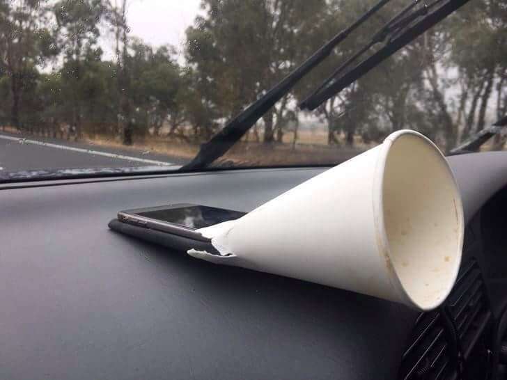 ▼車上的音響壞掉時,使用手機和一個紙杯來解決沒有音樂的問題吧。