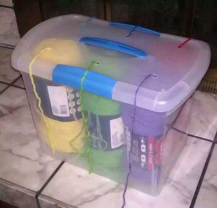 ▼在收納箱上鑽幾個洞,就不用一直將毛線拿出來了。
