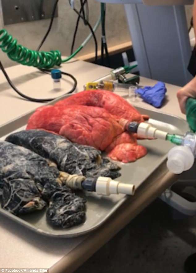 ▼Amanda展示了一個抽菸20多年的老菸民的肺,還有一個正常的肺。菸民的肺已經被薰成了黑色,出現多種病變。