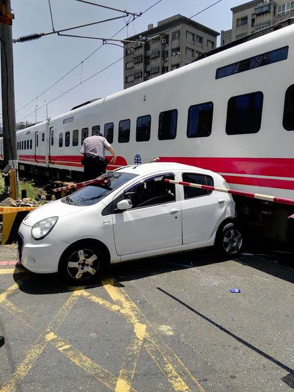 三寶開車沒有極限,這次竟然直接駛上平交道,與普悠瑪號發生擦撞。白色轎車當場被截成兩段,所幸最後無人傷亡。