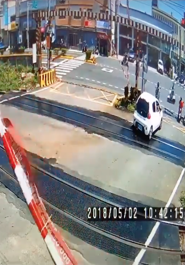▼5月2日上午10點多,新竹市的中華路三段與中山路口平交道發生撞車事件。從監視器可以看到,一台白色的轎車開進平交道內,卻突然停滯不前,接下來平交道警告聲也響起,欄杆落下。