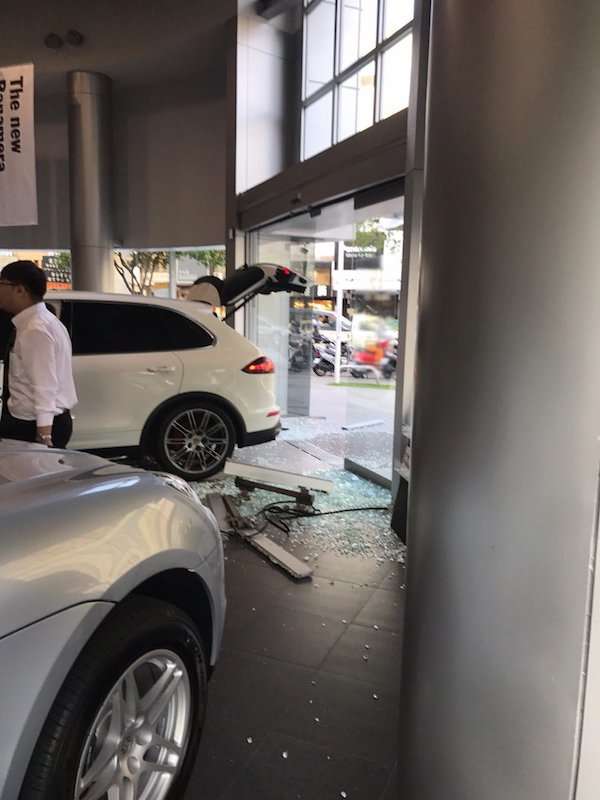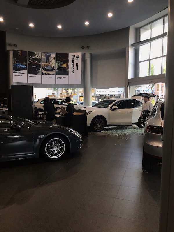 2018年05月03日台中市南屯區保時捷展示中心驚傳一起撞車事件!2日的下午5時許,一輛白色保時捷突然直衝展示中心的正門,把門口玻璃都撞碎。事後才傳出車主是和車商有購車糾紛,才會憤怒展開報復!