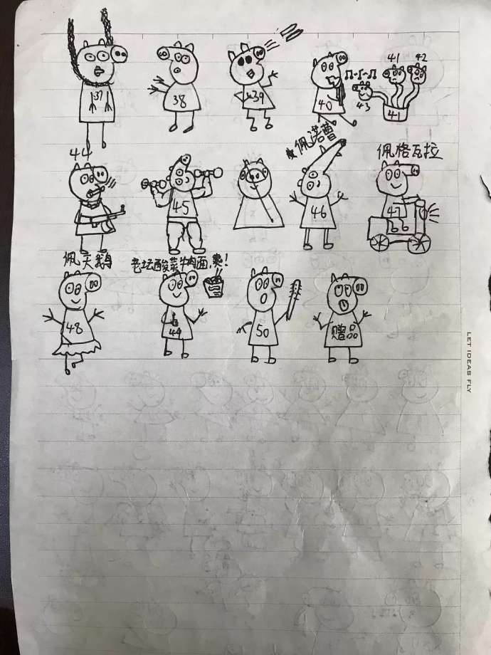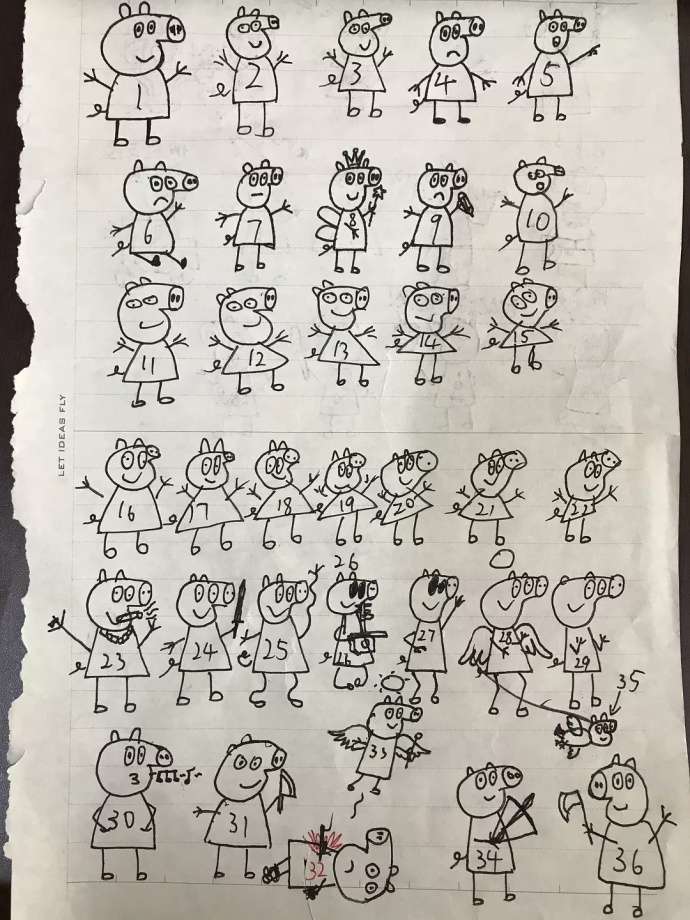 ▼一開始,小朋友畫得還算中規中矩,但在23隻後就放飛自我,想像力大爆發,讓佩佩豬變成各種搞笑形象!