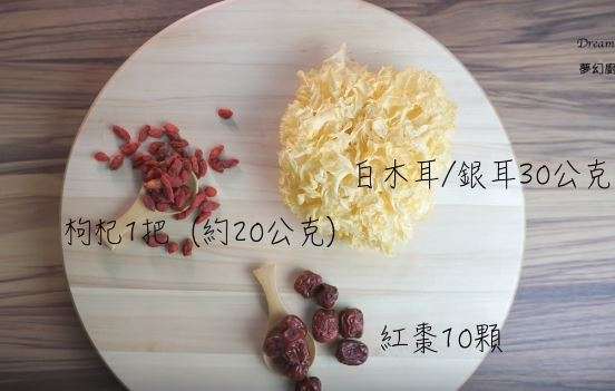 準備食材:蓮子、紅棗(10g)、銀耳(30g)、枸杞1把(約20g)、百合乾、清水(2000c.c.,可依濃度自行調整)、冰糖或蜂蜜(依喜好添加)