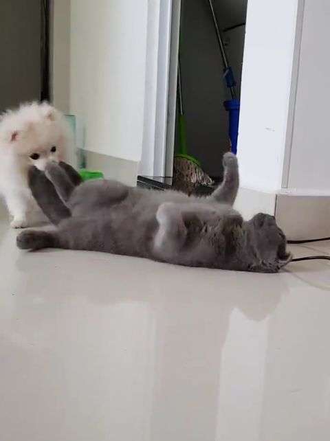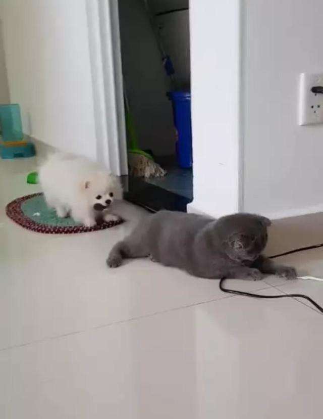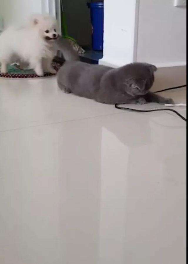 ▼家裡的貓咪正趴在地上玩電線,狗狗竟然跑過來咬住牠的尾巴。如果遇上脾氣不好的貓咪,狗狗避免不了一場「爆揍」。