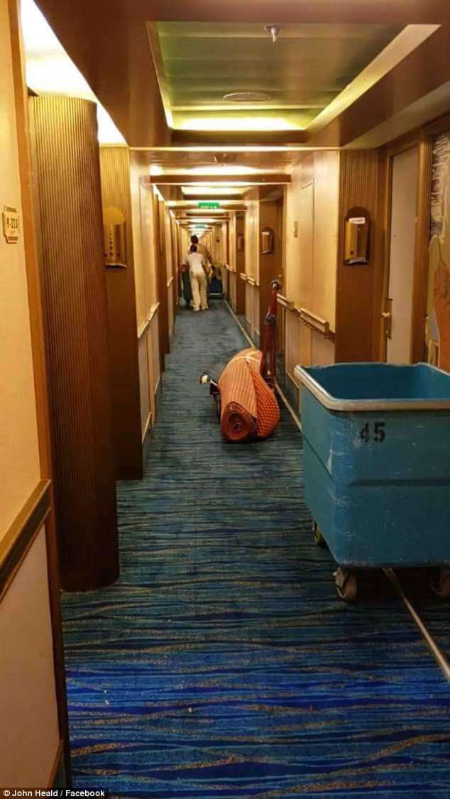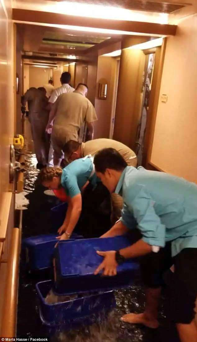 ▼根據船上乘客分享的照片和資訊,這件事情發生在5月3日,嘉年華夢想號的第9客艙中。當時船上的工作人員紛紛出動將水裝到塑膠盆中運出去。