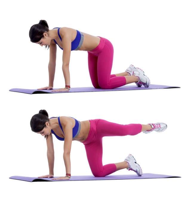 背部保持平直,把一邊的腿抬起,並與另外一條腿維持90度角,重複10次這個動作,再換另一條腿。