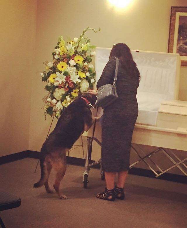 ▼10天之後,家人幫爸爸舉辦了葬禮,家人知道Sadie很愛爸爸,就破例讓牠參加。那天Sadie跟著媽媽來到棺材前,終於見到了好久不見的爸爸。牠非常激動,立刻跳起來趴在棺材上,搖著尾巴悲鳴,看起來很悲傷。
