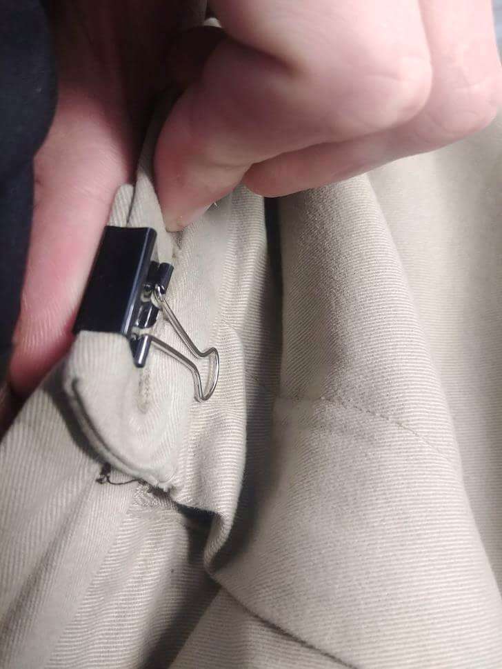 ▼褲子鈕扣爆掉時先用長尾夾夾住吧。