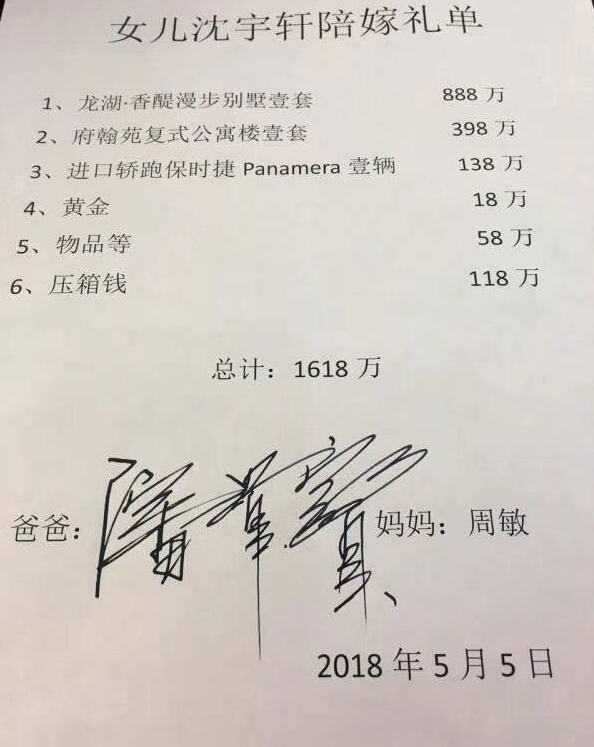 ▼可能很多人都覺得新郎和新娘外表很不搭,但看了下面的嫁妝清單,相信都會閉上嘴了。「女兒沈宇軒陪嫁禮單」,包括一幢位於西安888萬(約新台幣4150萬元)的「龍湖香醍漫步」別墅、一棟398萬(約新台幣1860萬元)「府翰苑」公寓、138萬(約新台幣645萬)保時捷、18萬黃金、58萬物品、118萬(約新台幣551萬元)壓歲錢,這些豪華的嫁妝總計1618萬人民幣。最後父親還簽名落款,時間是「2018年5月5日」。
