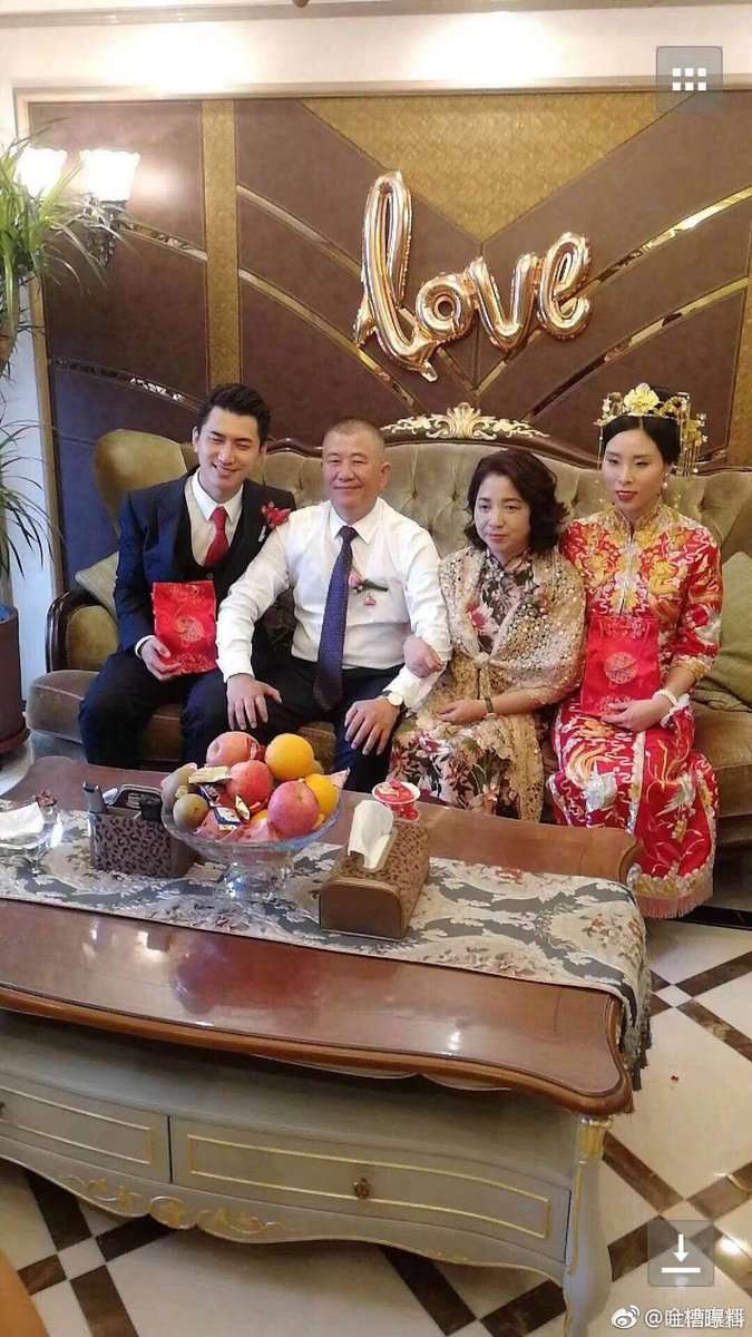 ▼在新人和女方的父母的合照中,相貌俊朗的新郎喜形於色,瞇著眼睛笑的合不攏,而新娘則差強人意,雖然畫了妝,穿著鳳冠霞帔,但是也掩蓋不了上吊的眼睛,和因為齙牙關不住的嘴巴,中間的父親則是一臉微笑,看起來對新郎很滿意,坐在隔壁的母親的表情就意味深長了,好像有點在苦笑,顯得不是那麼開心。