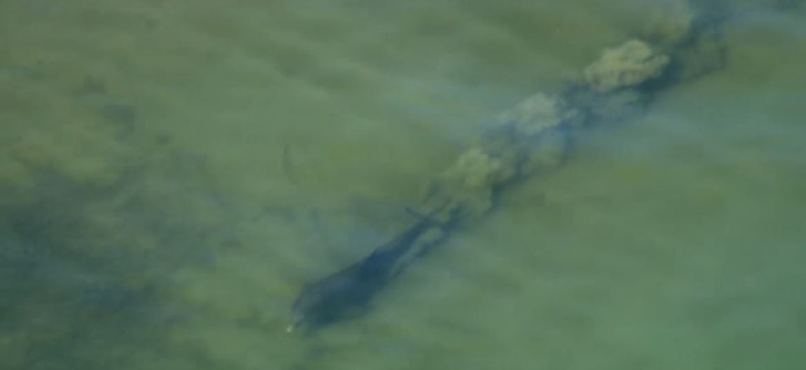 ▼一隻海豚忽然開始使用尾鰭拍打海底。