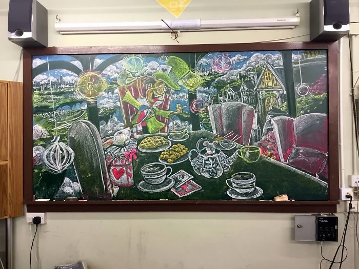 2018年05月17日教室太單調?那就想辦法裝飾一下!香港協恩中學的一些學生就決定給教室增添一點色彩,他們組成了一個名為「Illusdreamer」的創作團體,有時間就用粉筆在黑板上作畫。這些的黑板畫超精彩,同學們都很愛。